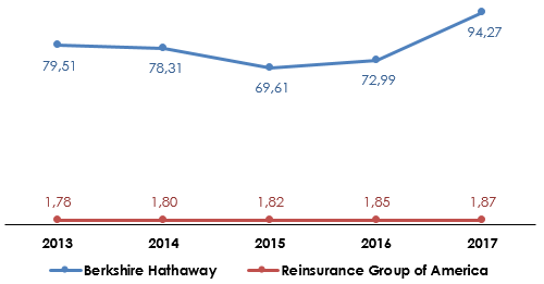 Berkshire Hathaway vs Reinsurance Group of America : évolution du chiffre d’affaires (2013-2017)