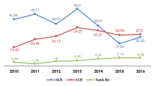 CCR vs SCR vs Tunis Re : évolution du chiffre d’affaires (2010-2016)
