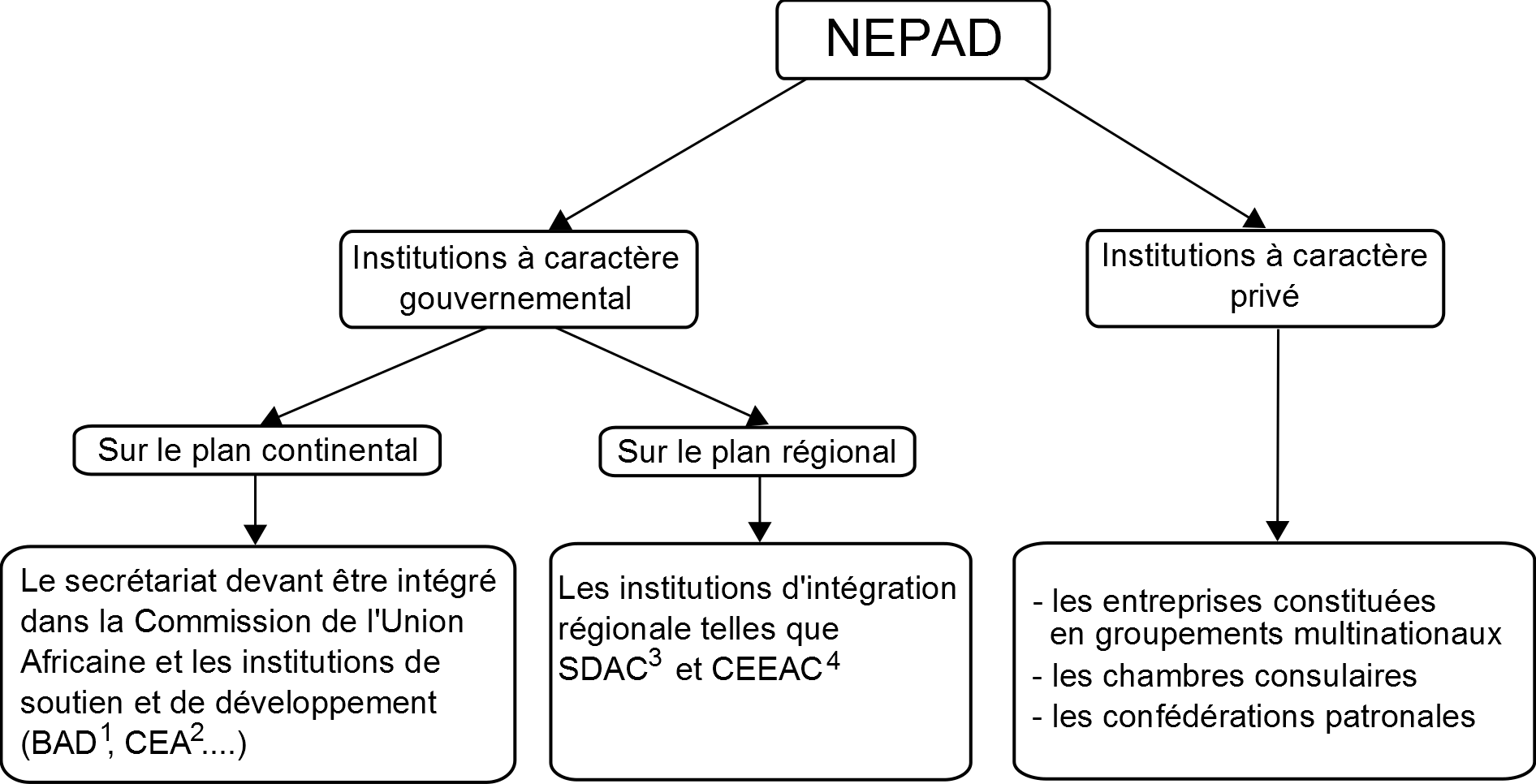Outre ces opérateurs, chargés de la mise en œuvre des projets NEPAD, on retrouve des structures hiérarchiques dont la tâche relève de l'élaboration et de la supervision des projets.